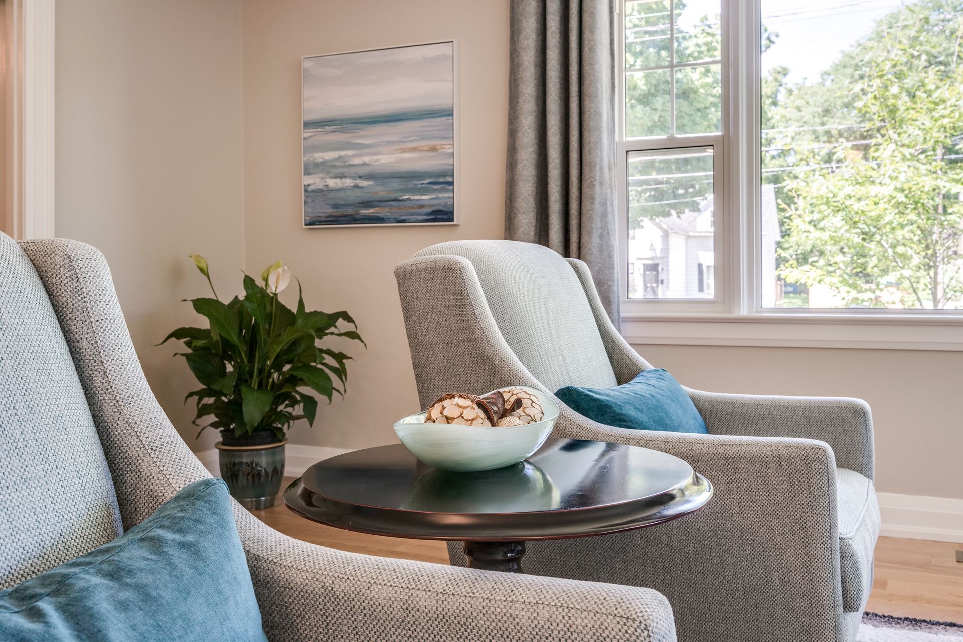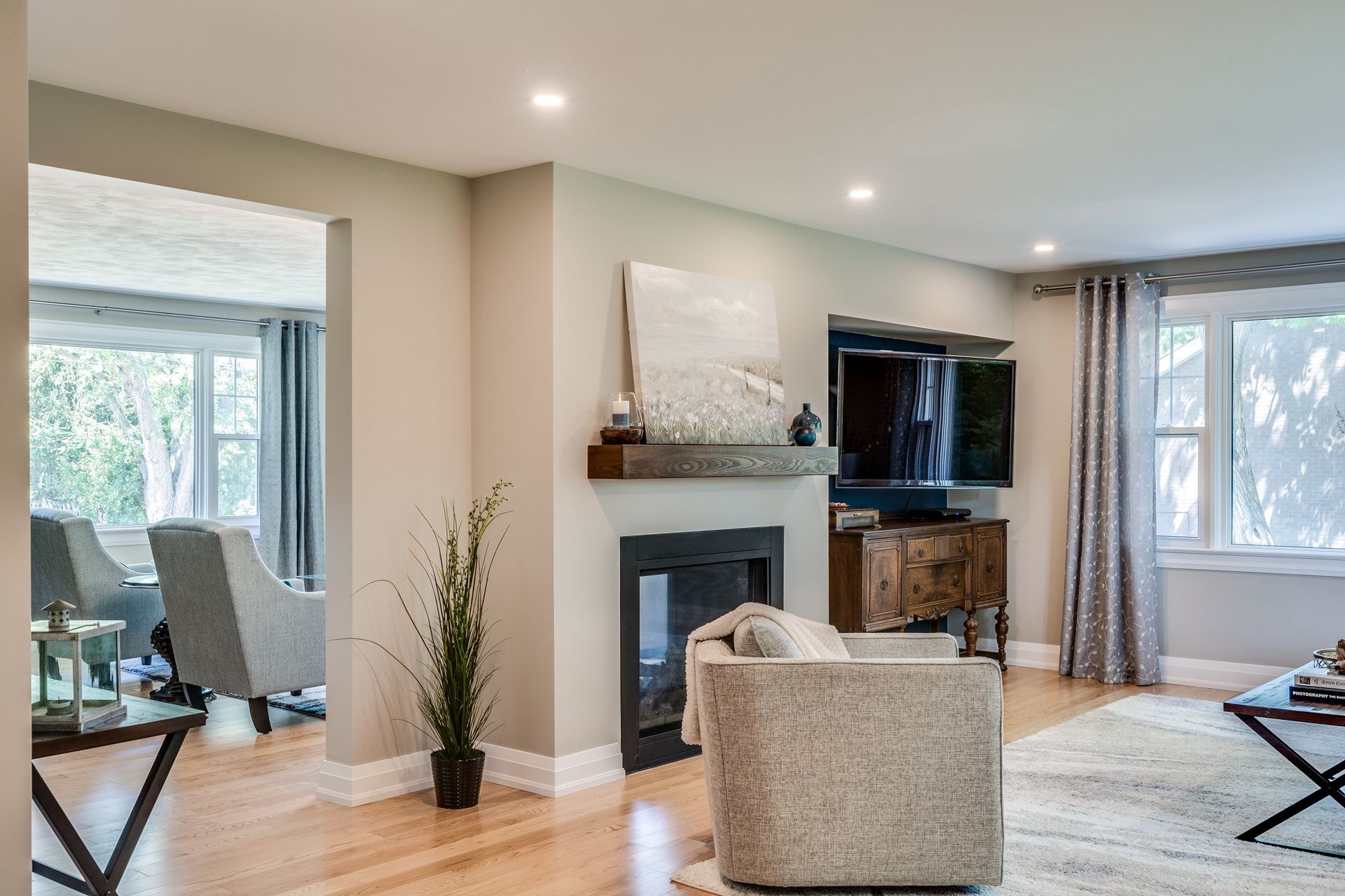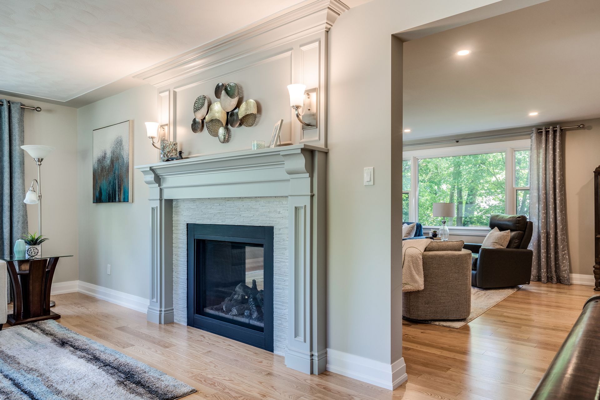 A dual-sided fireplace, merging casual comfort with formal finesse, defines chic versatility. Carefully curated furnishings elevate this space, tailored for the dynamic rhythm of a bustling family